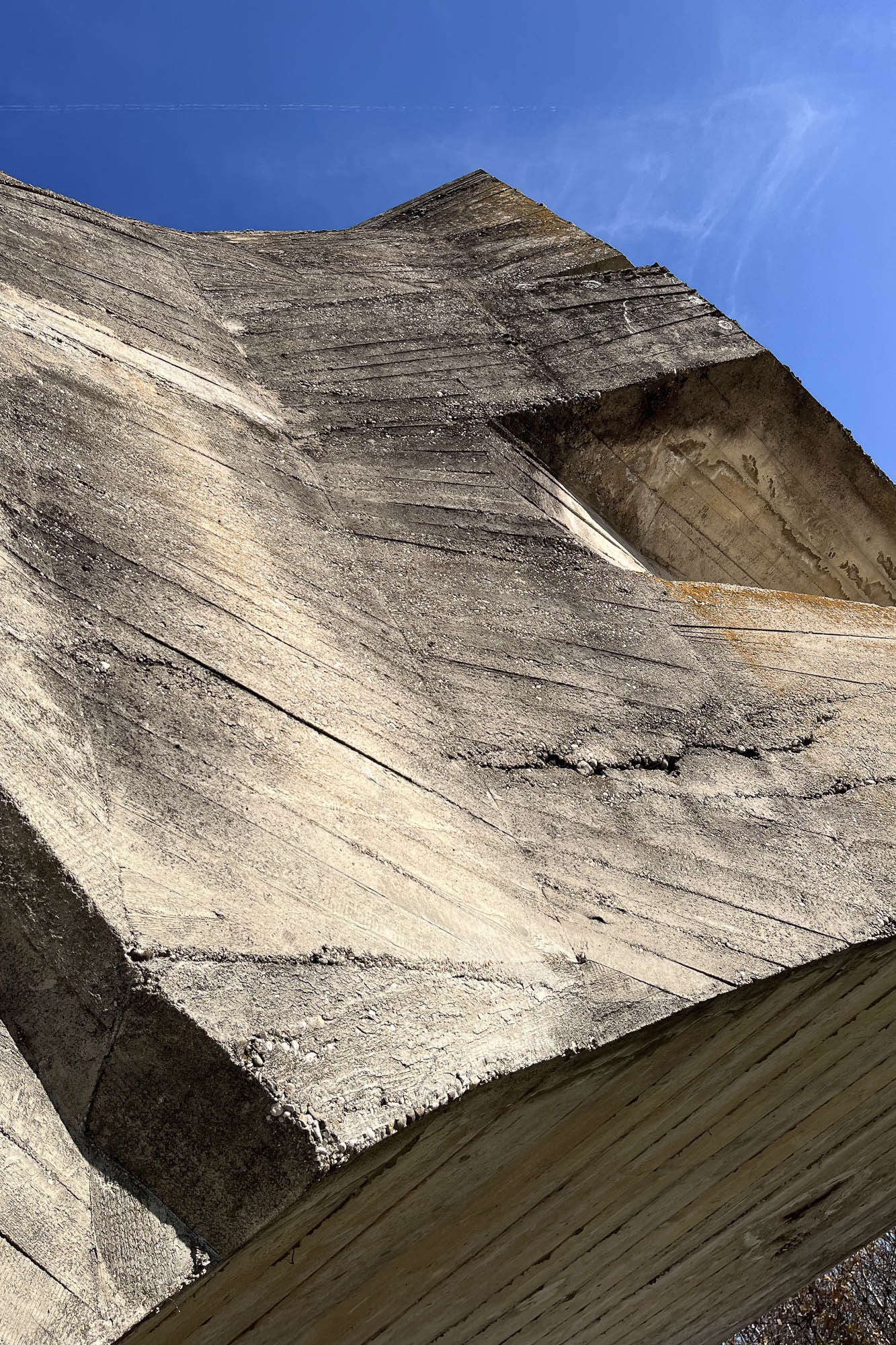 Past a few stairs, an archway, and between landscaping that concealed earthen-crypts, stood this imposing asymmetric concrete monument. Rising from the slim base, the wings expand outwards from the eye-shaped aluminium panels which look both at you and out into the valley.